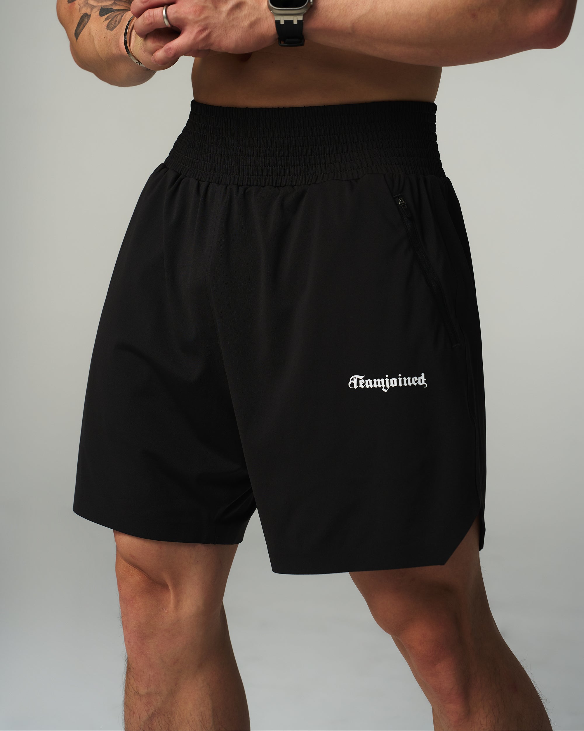 Joined® Limitless Gothic Stretch Shorts feature Limitless seamless-fit technology for a sleek, functional training look. With an adjustable drawstring, YKK zippered pockets, a wide waistband, and side slits, they deliver comfort, mobility, and performance. The Gothic logo detail adds a bold yet subtle touch, ensuring effortless style in and out of the gym.